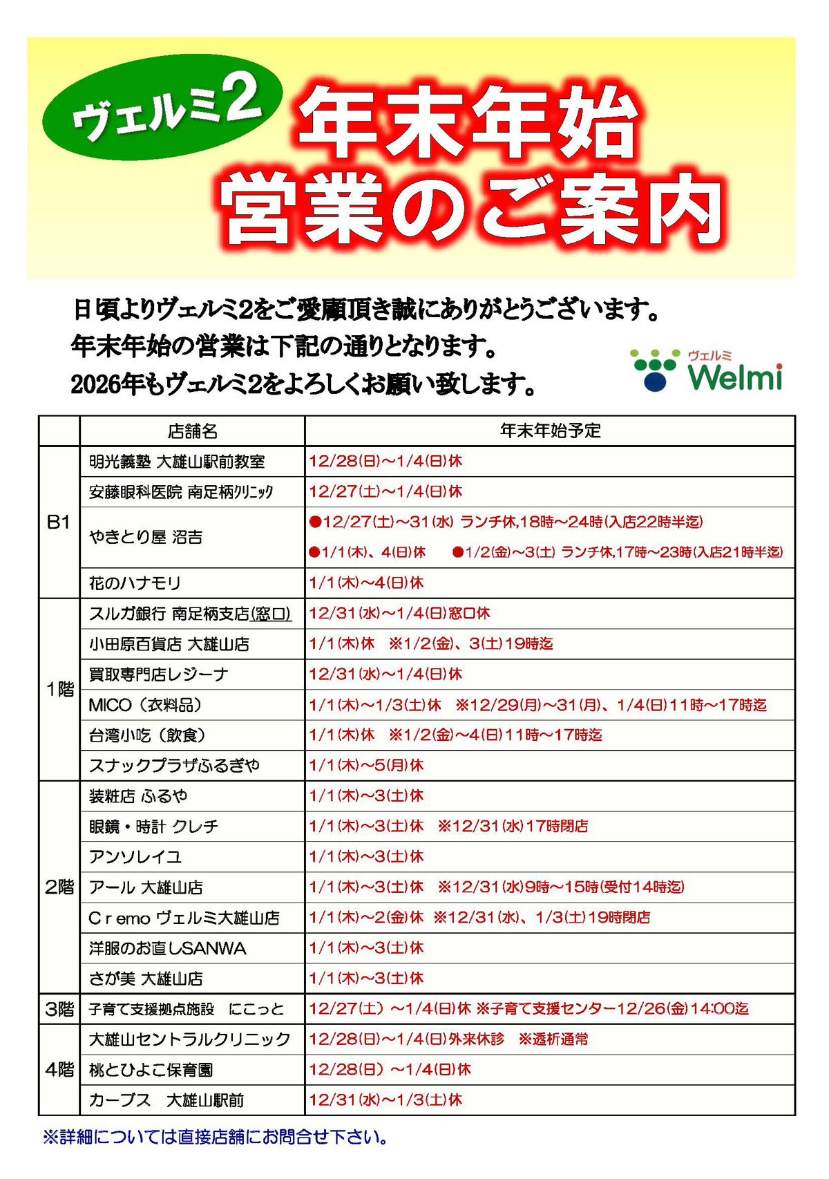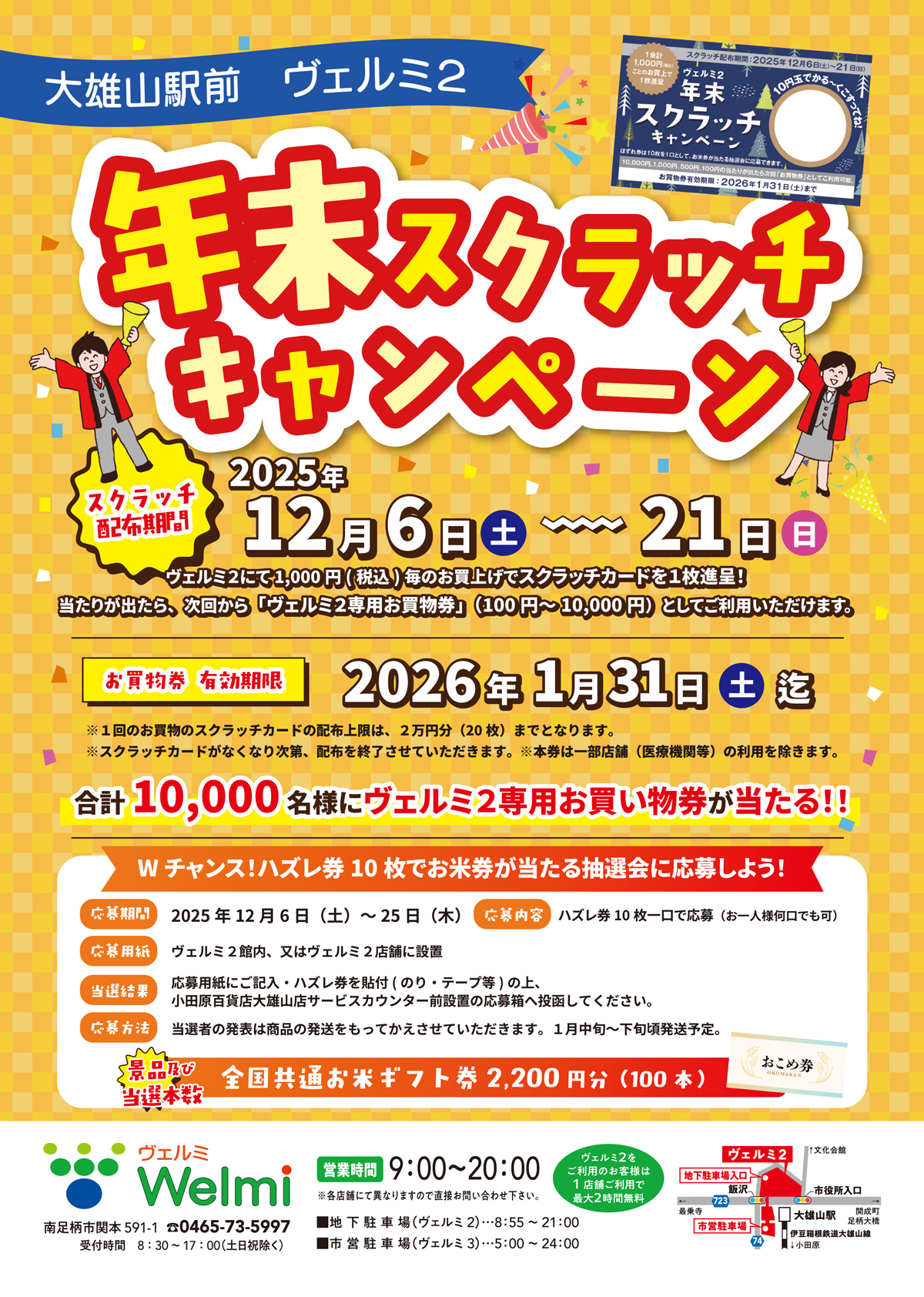 ↑『タウンニュース〈足柄版〉』はこちらから ↑『 ヴェルミクラフトマーケット』インスタグラムはこちらから ↑ご近所情報サイト『 レアリア』はこちらから ヴェルミ2 年末スクラッチキャンペーンのご案内 日頃よりヴェルミ2をご愛顧いただきき誠にありがとうございます。 年末年始の営業は下記の通りとなります。 2026年もヴェルミ2をよろしくお願いいたします。 ヴェルミ2 年末スクラッチキャンペーンのご案内 12月6日(土)〜12月21日(日)ヴェルミ2にて1,000円(税込)毎のお買上げで『スクラッチカード』を1枚進呈!当りが出たら、次回から『ヴェルミ2専用お買物券』(100円〜10,000円)としてご利用いただけます。ぜひ、皆さまお誘い合わせの上、ご来店ください。 ※1回のお買物のスクラッチカードの配布上限は、2万円分(20枚)までとなります。※スクラッチカードがなくなり次第、配布を終了させていただきます。※本券は一部店舗(医療機関等)の利用を除きます。※詳しくは下記掲載情報をご覧ください。 ヴェルミ2 12月ファミリーフェスティバル開催のご案内 12月6日(土)ヴェルミ2にて「ファミリーフェスティバル」を開催いたします!ご家族やお子さまが楽しめるいろいろなイベントが開催されます。ぜひ、皆さまお誘い合わせの上、ご来店ください。詳しくは下記掲載情報をご覧ください。 ※状況により入場制限させていただく場合もございます。※開催時間が変更になる場合がございます。 ヴェルミ2 新店舗のご案内 キッチンカーで大好評の「クエストクレープ」がヴェルミにやってきました。小田原百貨店さんの前で常設(毎週月・火定休)にて営業してます。小田原産の食材を使ったクレープがおススメです。テイクアウトもできます! 詳しくは下記掲載情報をご覧ください。 ヴェルミ2 8月ファミリーフェスティバル開催のご案内 8月2日(土)ヴェルミ2にて「ファミリーフェスティバル」を開催いたします!ご家族やお子さまが楽しめるいろいろなイベントが開催されます。ぜひ、皆さまお誘い合わせの上、ご来店ください。詳しくは下記掲載情報をご覧ください。 ※状況により入場制限させていただく場合もございます。※開催時間が変更になる場合がございます。 ヴェルミ2 買取専門店レジ〜ナ大雄山ヴェルミ店 2025年2月28日(金)、ヴェルミ2・1階にニューオープン! ヴェルミ 4月ファミリーフェスティバル開催のご案内 4月12日(土)ヴェルミ2にて「ファミリーフェスティバル」を開催いたします!「Let'sおしごと隊」や「こども免許発行イベント」、「交通安全教室」、「電動ミニカー乗車」など、ご家族やお子さまが楽しめるいろいろなイベントが開催されます。ぜひ、皆さまお誘い合わせの上、ご来店ください。詳しくは下記掲載情報をご覧ください。 ※状況により入場制限させていただく場合もございます。※開催時間が変更になる場合がございます。 森永製菓×小田急百貨店「母の日オリジナルラベル作り」開催のご案内 5月10日(土)小田原百貨店大雄山店イートインコーナー にて「森永製菓 母の日オリジナルラベル作り」を開催いたします!1部・2部に分かれ、当日プログラムを実施いたします。各回先着20名様。小田原百貨店大雄山店サービスカウンターにて受付いたします。 ぜひ、皆さまお誘い合わせの上、ご来店ください。 詳しくは下記掲載情報をご覧ください。 ヴェルミ2・3月ファミリーフェスティバル開催のご案内 3月8日(土)ヴェルミ2にて「ファミリーフェスティバル」を開催いたします!「ドローン操縦体験・最新物流運搬ドローン展示」や「ペンキを塗って遊ぼう」など、ご家族やお子さまが楽しめるいろいろなイベントが開催されます。ぜひ、皆さまお誘い合わせの上、ご来店ください。詳しくは下記掲載情報をご覧ください。 ※状況により入場制限させていただく場合もございます。※開催時間が変更になる場合がございます。 ページトップ▲