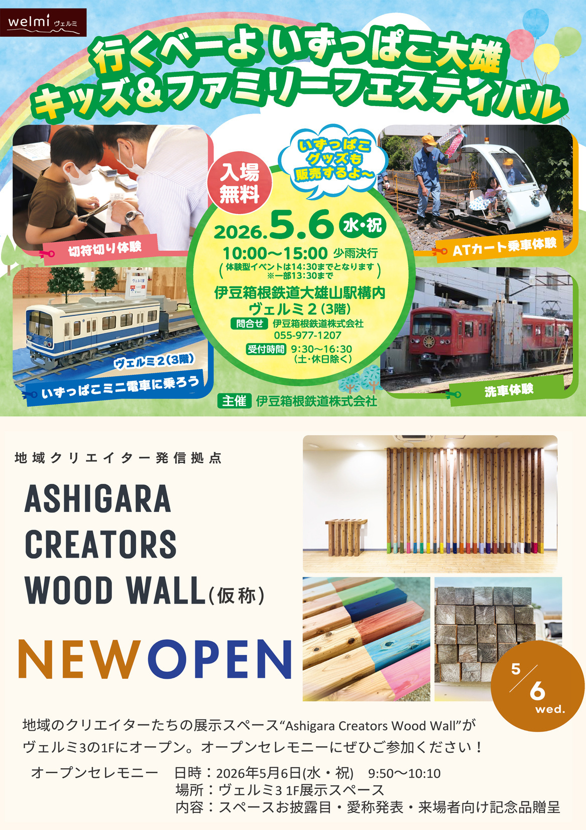 ヴェルミは、地域に暮らす皆さまの毎日をお手伝いしていきます。 Welmi(ヴェルミ)とは、オランダ語のwel(「水源」「泉」の意味)と 南足柄のmiを合わせた合成語です。 2026.4.14 ヴェルミ2キッズ&ファミリーフェスティバルのご案内 5月6日(水・祝)ヴェルミ2にて「キッズ&ファミリーフェスティバル」を開催いたします!ご家族やお子さまが楽しめるいろいろなイベントが開催されます。ぜひ、皆さまお誘い合わせの上、ご来店ください。 2025.12.22 ヴェルミ2年末年始営業のご案内 日頃よりヴェルミ2をご愛顧いただき誠にありがとうございます。年末年始の営業は下記の通りとなります。2026年もヴェルミ2をよろしくお願いいたします。 2025.11.26 ヴェルミ2年末スクラッチキャンペーンのご案内 12月6日(土)〜12月21日(日)ヴェルミ2にて1,000円(税込)毎のお買上げで『スクラッチカード』を1枚進呈!当りが出たら、次回から『ヴェルミ2専用お買物券』(100円〜10,000円)としてご利用いただけます。ぜひ、皆さまお誘い合わせの上、ご来店ください。 2025.11.12 ヴェルミ2ファミリーフェスティバルのご案内 12月6日(土)ヴェルミ2にて「ファミリーフェスティバル」を開催いたします!ご家族やお子さまが楽しめるいろいろなイベントが開催されます。ぜひ、皆さまお誘い合わせの上、ご来店ください。 2025.7.19 ヴェルミ2ファミリーフェスティバルのご案内 8月2日(土)ヴェルミ2にて「ファミリーフェスティバル」を開催いたします!ご家族やお子さまが楽しめるいろいろなイベントが開催されます。ぜひ、皆さまお誘い合わせの上、ご来店ください。 2025.4.8 ヴェルミ2・1階買取専門店レジ〜ナ大雄山ヴェルミ店NEW OPEN! 2025.3.31 森永製菓「母の日オリジナルラベル作り」のご案内 5月10日(土)小田原百貨店大雄山店イートインコーナーにて「森永製菓 母の日オリジナルラベル作り」を開催いたします!1部・2部に分かれ、当日プログラムを実施いたします。各回先着20名様。小田原百貨店大雄山店サービスカウンターにて受付いたします。ぜひ、皆さまお誘い合わせの上、ご来店ください。 2025.3.31 ヴェルミ2ファミリーフェスティバルのご案内 4月12日(土)ヴェルミ2にて「ファミリーフェスティバル」を開催いたします!「Let'sおしごと隊」や「こども免許発行イベント」、「交通安全教室」、「電動ミニカー乗車」など、ご家族やお子さまが楽しめるいろいろなイベントが開催されます。ぜひ、皆さまお誘い合わせの上、ご来店ください。 2025.2.13 ヴェルミ2ファミリーフェスティバルのご案内 3月8日(土)ヴェルミ2にて「ファミリーフェスティバル」を開催いたします!「ドローン操縦体験・最新物流運搬ドローン展示」や「ペンキを塗って遊ぼう」など、ご家族やお子さまが楽しめるいろいろなイベントが開催されます。ぜひ、皆さまお誘い合わせの上、ご来店ください。