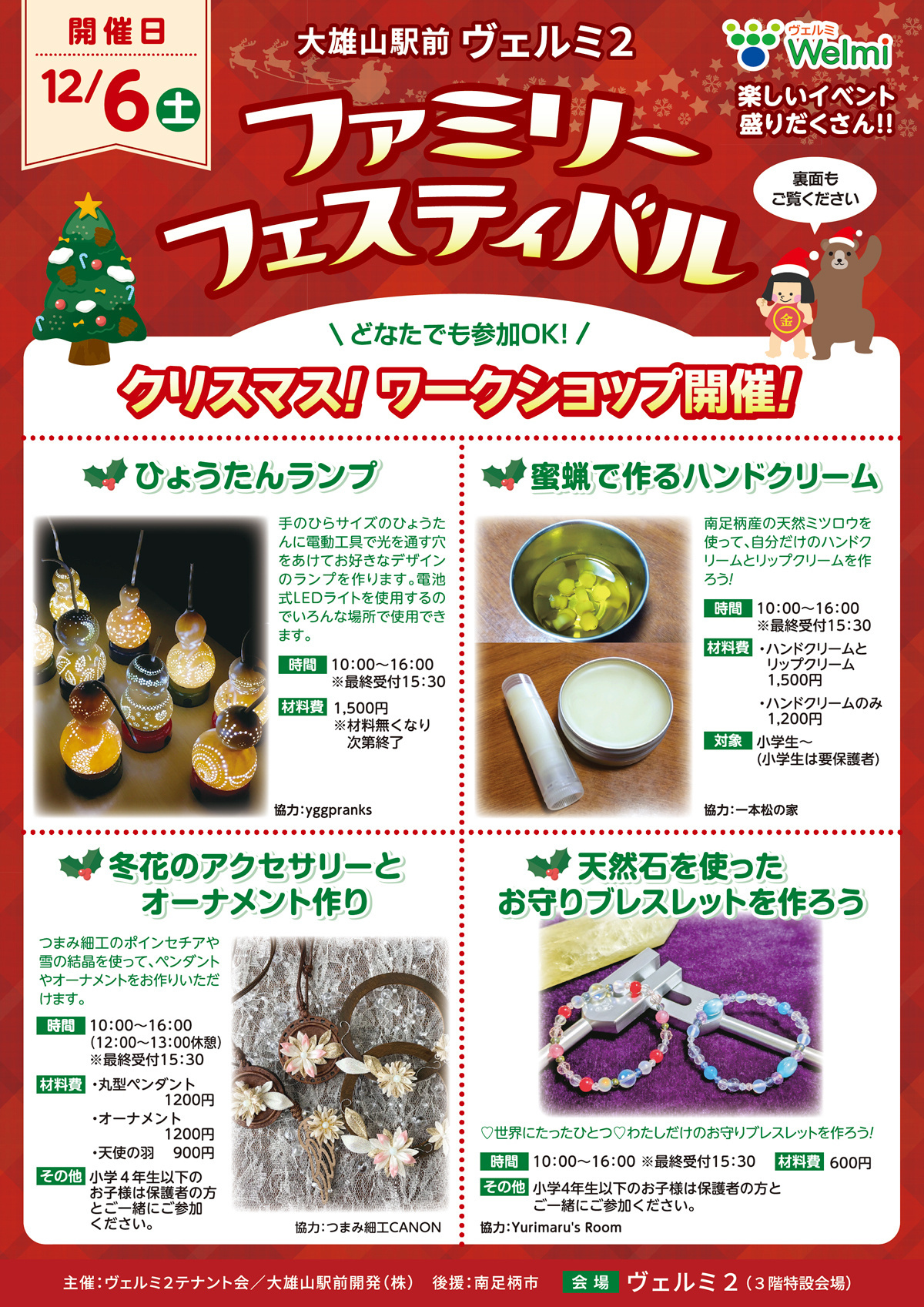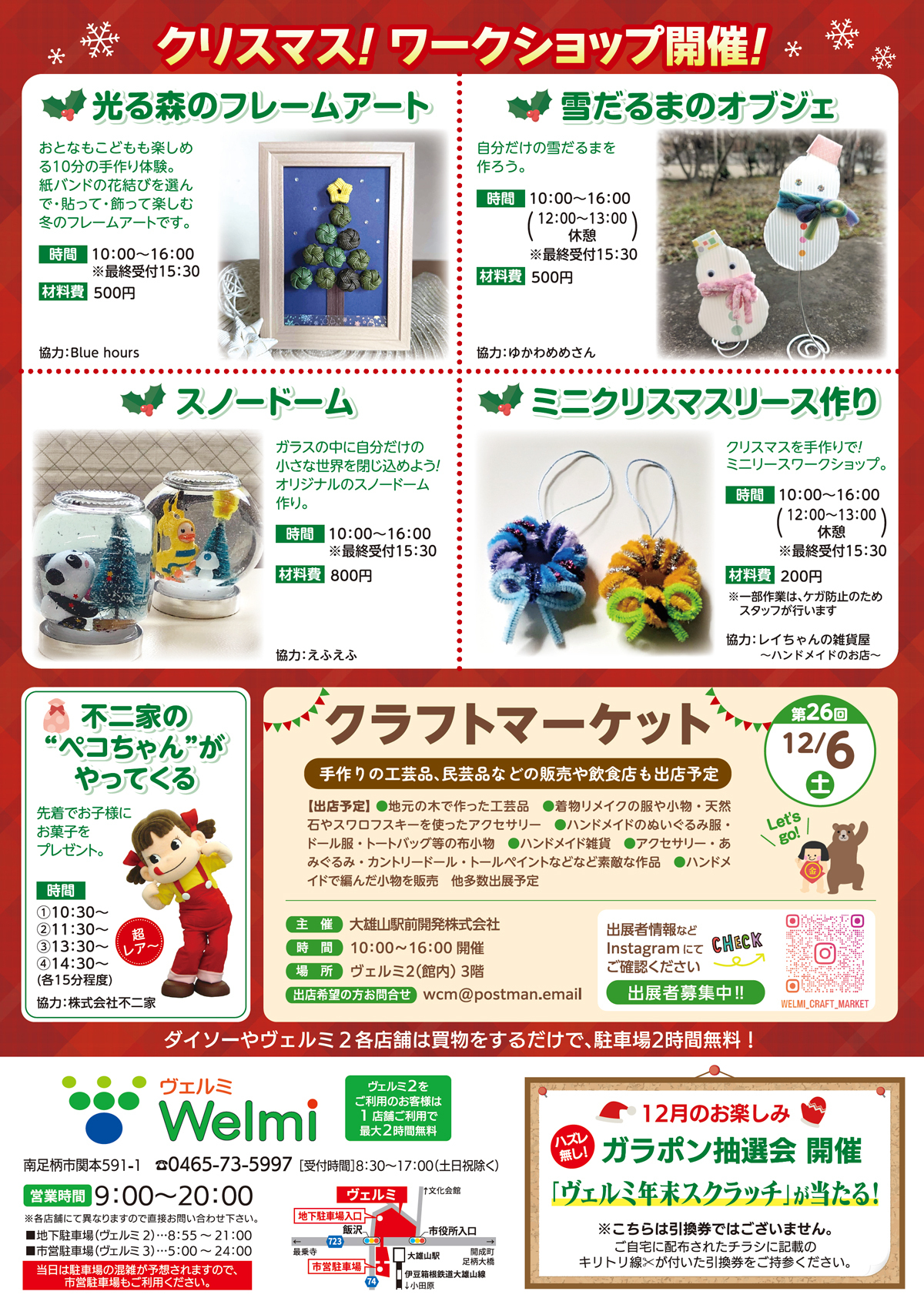 ↑『タウンニュース〈足柄版〉』はこちらから ↑『 ヴェルミクラフトマーケット』インスタグラムはこちらから ↑ご近所情報サイト『 レアリア』はこちらから ヴェルミ2 5月キッズ&ファミリーフェスティバル開催のご案内 5月6日(水・祝)ヴェルミ2にて「キッズ&ファミリーフェスティバル」を開催いたします!10時〜15時までご家族やお子さまが楽しめるいろいろなイベントが開催されます。(体験型イベントは14時30分までとなります。※一部13時30分まで)ぜひ、皆さまお誘い合わせの上、ご来店ください。詳しくは下記掲載情報をご覧ください。 ※状況により入場制限させていただく場合もございます。※開催時間が変更になる場合がございます。 ヴェルミ2 年末スクラッチキャンペーンのご案内 日頃よりヴェルミ2をご愛顧いただきき誠にありがとうございます。 年末年始の営業は下記の通りとなります。 2026年もヴェルミ2をよろしくお願いいたします。 ヴェルミ2 年末スクラッチキャンペーンのご案内 12月6日(土)〜12月21日(日)ヴェルミ2にて1,000円(税込)毎のお買上げで『スクラッチカード』を1枚進呈!当りが出たら、次回から『ヴェルミ2専用お買物券』(100円〜10,000円)としてご利用いただけます。ぜひ、皆さまお誘い合わせの上、ご来店ください。 ※1回のお買物のスクラッチカードの配布上限は、2万円分(20枚)までとなります。※スクラッチカードがなくなり次第、配布を終了させていただきます。※本券は一部店舗(医療機関等)の利用を除きます。※詳しくは下記掲載情報をご覧ください。 ヴェルミ2 12月ファミリーフェスティバル開催のご案内 12月6日(土)ヴェルミ2にて「ファミリーフェスティバル」を開催いたします!ご家族やお子さまが楽しめるいろいろなイベントが開催されます。ぜひ、皆さまお誘い合わせの上、ご来店ください。詳しくは下記掲載情報をご覧ください。 ※状況により入場制限させていただく場合もございます。※開催時間が変更になる場合がございます。 ヴェルミ2 新店舗のご案内 キッチンカーで大好評の「クエストクレープ」がヴェルミにやってきました。小田原百貨店さんの前で常設(毎週月・火定休)にて営業してます。小田原産の食材を使ったクレープがおススメです。テイクアウトもできます! 詳しくは下記掲載情報をご覧ください。 ヴェルミ2 8月ファミリーフェスティバル開催のご案内 8月2日(土)ヴェルミ2にて「ファミリーフェスティバル」を開催いたします!ご家族やお子さまが楽しめるいろいろなイベントが開催されます。ぜひ、皆さまお誘い合わせの上、ご来店ください。詳しくは下記掲載情報をご覧ください。 ※状況により入場制限させていただく場合もございます。※開催時間が変更になる場合がございます。 ヴェルミ2 買取専門店レジ〜ナ大雄山ヴェルミ店 2025年2月28日(金)、ヴェルミ2・1階にニューオープン! ヴェルミ 4月ファミリーフェスティバル開催のご案内 4月12日(土)ヴェルミ2にて「ファミリーフェスティバル」を開催いたします!「Let'sおしごと隊」や「こども免許発行イベント」、「交通安全教室」、「電動ミニカー乗車」など、ご家族やお子さまが楽しめるいろいろなイベントが開催されます。ぜひ、皆さまお誘い合わせの上、ご来店ください。詳しくは下記掲載情報をご覧ください。 ※状況により入場制限させていただく場合もございます。※開催時間が変更になる場合がございます。 森永製菓×小田急百貨店「母の日オリジナルラベル作り」開催のご案内 5月10日(土)小田原百貨店大雄山店イートインコーナー にて「森永製菓 母の日オリジナルラベル作り」を開催いたします!1部・2部に分かれ、当日プログラムを実施いたします。各回先着20名様。小田原百貨店大雄山店サービスカウンターにて受付いたします。 ぜひ、皆さまお誘い合わせの上、ご来店ください。 詳しくは下記掲載情報をご覧ください。 ヴェルミ2・3月ファミリーフェスティバル開催のご案内 3月8日(土)ヴェルミ2にて「ファミリーフェスティバル」を開催いたします!「ドローン操縦体験・最新物流運搬ドローン展示」や「ペンキを塗って遊ぼう」など、ご家族やお子さまが楽しめるいろいろなイベントが開催されます。ぜひ、皆さまお誘い合わせの上、ご来店ください。詳しくは下記掲載情報をご覧ください。 ※状況により入場制限させていただく場合もございます。※開催時間が変更になる場合がございます。 ページトップ▲